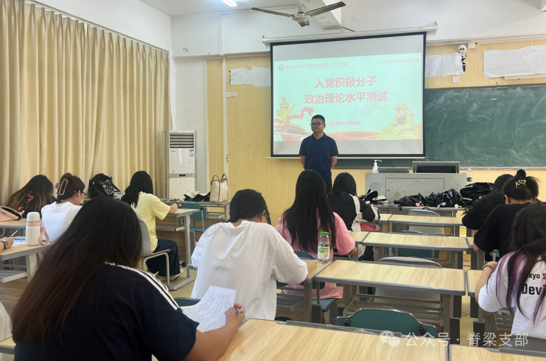 为了检验入党积极分子政治理论学习成果,提升党员发展质量。2024年11月8日上午,财务管理学院学生第二党支部在2-321教室开展2024年第2期入党积极分子政治理论测试。党支部书记丁菁华担任监考,经综合考核合格的24名入党积极分子参加了测试。