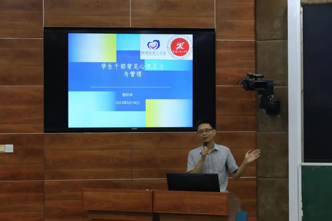 杨玖林老师给全体学生干部讲授了《学生干部心理压力与管理》,他从为何存在压力、压力的作用、如何调试好工作管理上的压力进行了讲解,他运用微视频、历史故事、心理小游戏让大家充分认识到压力是无处不在的,关键在于我们如何认识和进行管理,他的讲座生动形象、同学们受益匪浅。
