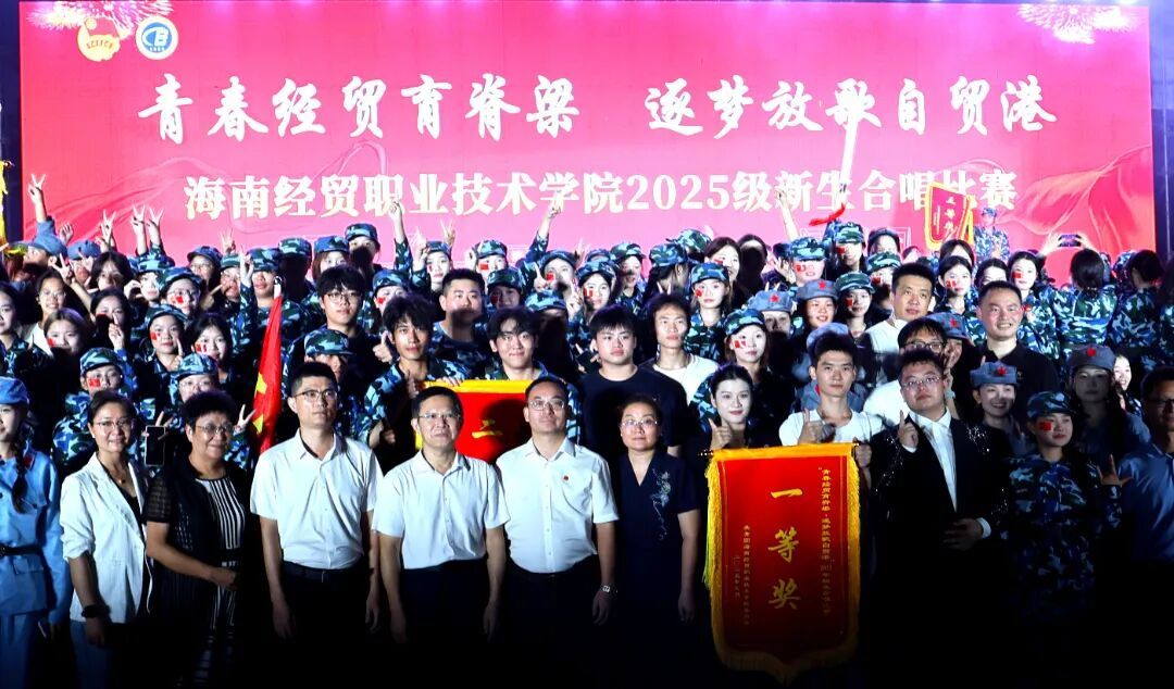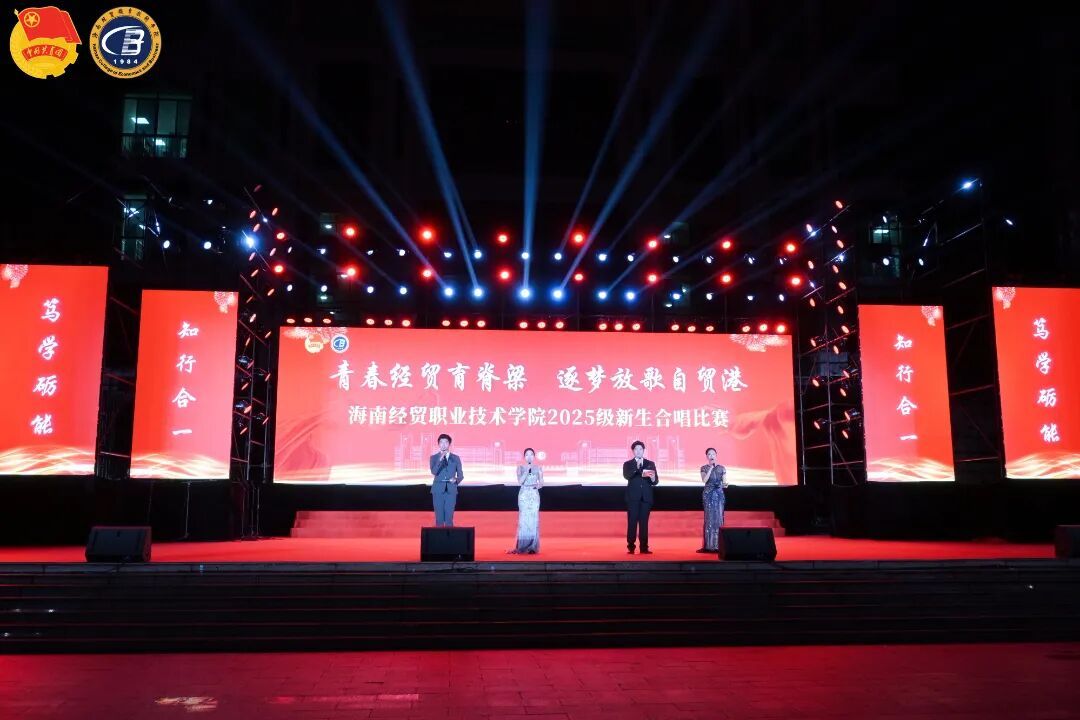 2025年9月29日晚上,海南经贸职业技术学院“青春经贸育脊梁,逐梦放歌自贸港!”2025级新生合唱比赛在经贸广场隆重举行。财务管理学院以一曲气势恢宏的《保卫黄河》,在众多参赛学院中脱颖而出,勇夺第一。